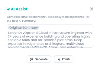 Use AI to generate summaries, rewrite bullet points, and improve clarity based on your experience and job goals.