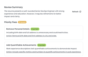 Receive suggestions to fix weak points, improve wording, and make your resume more effective for job applications.